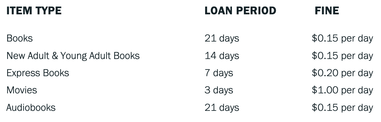 Overdue items will accrue fines and we cannot check out materials to patrons with fines exceeding $50. Please see below for loan periods and associated overdue fines: